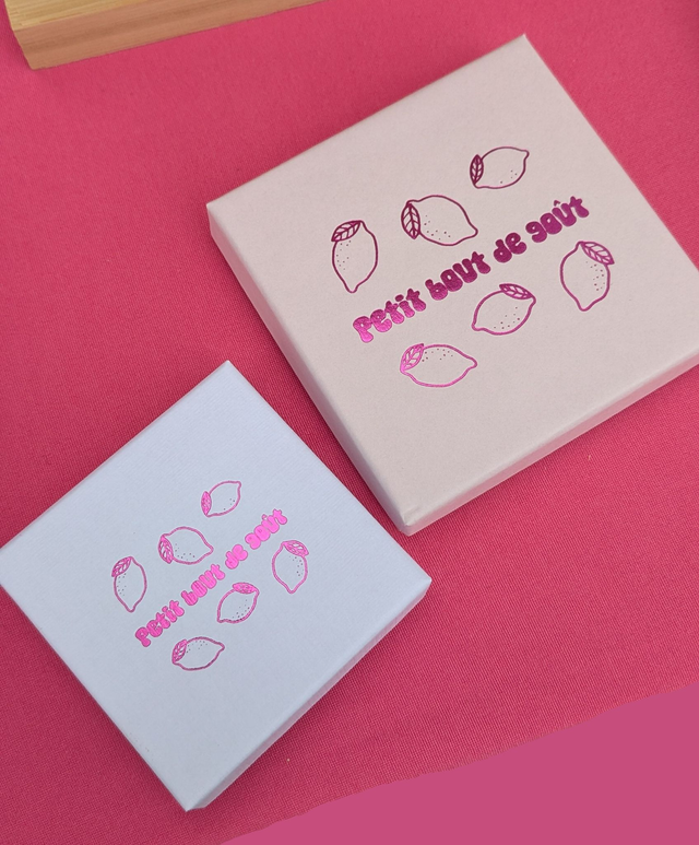 Les écrins sont fabriqués en Europe, avec un logo imaginé et dessiné par mes soins.